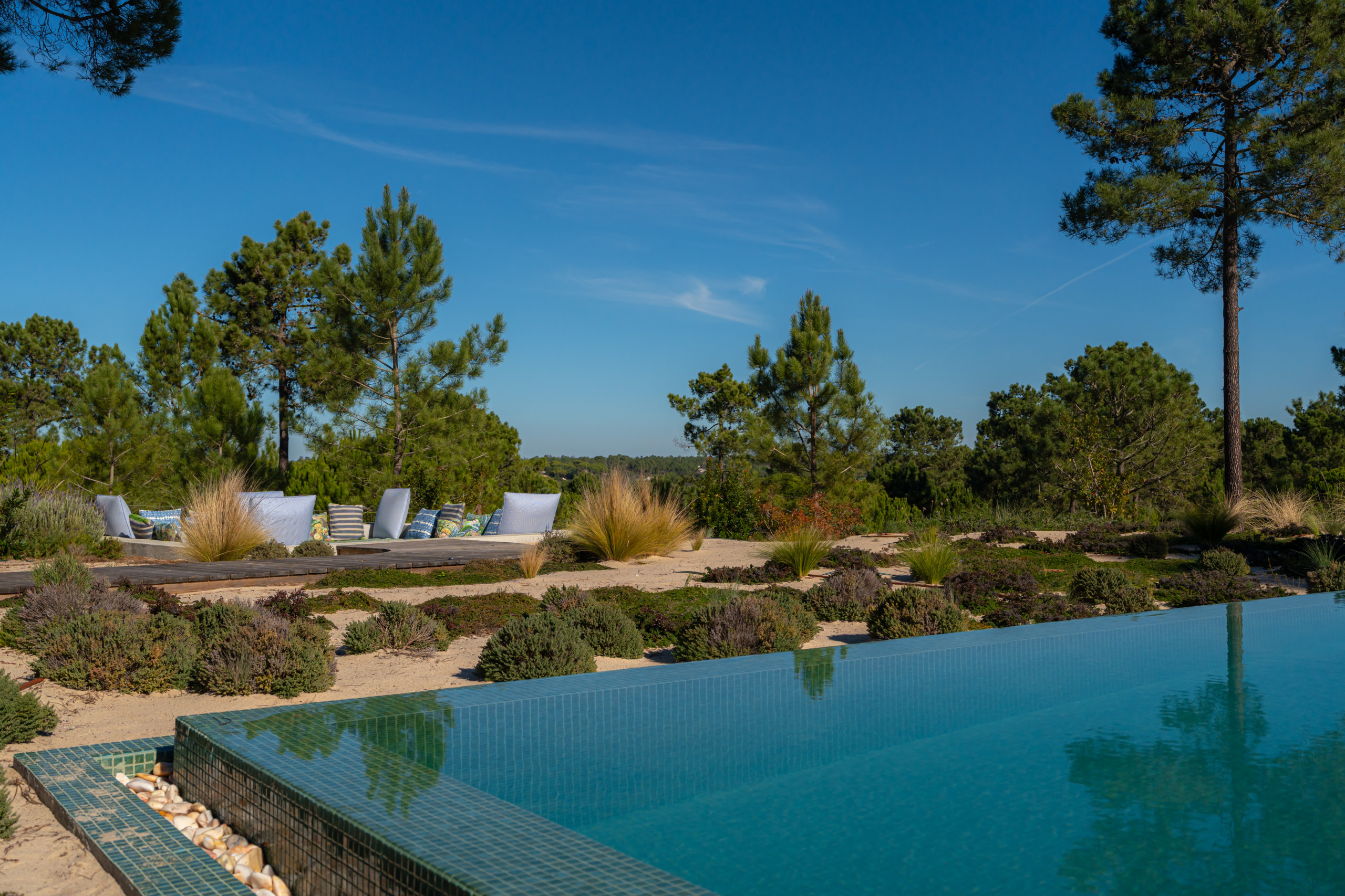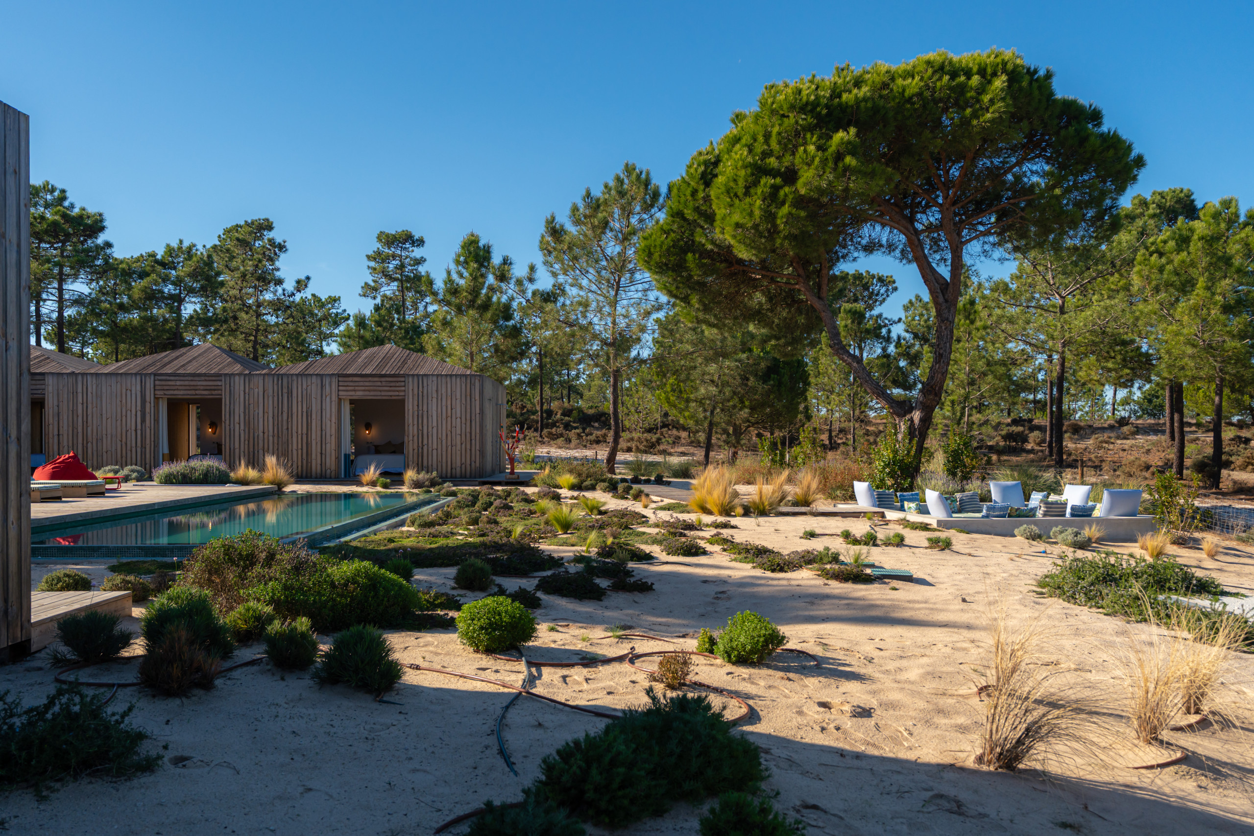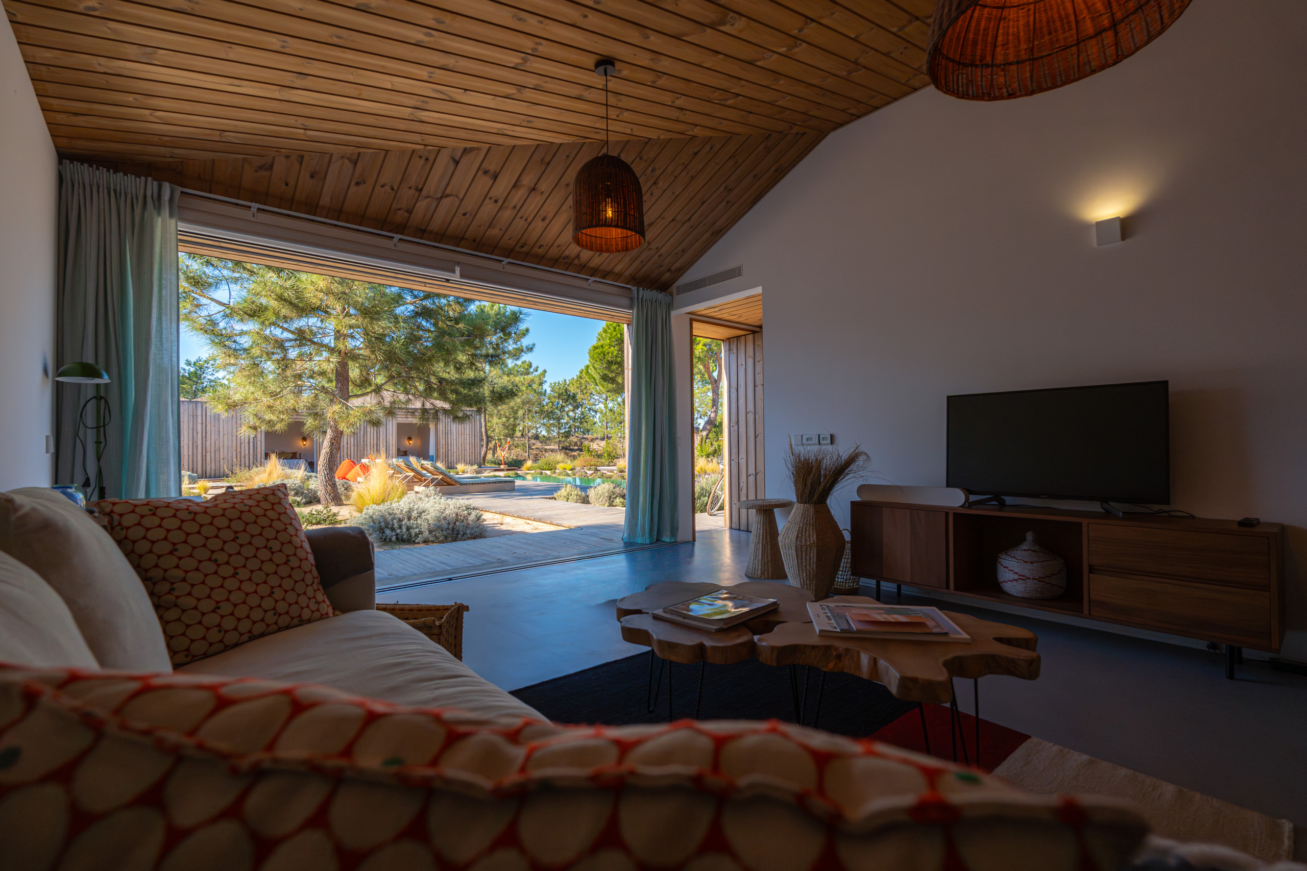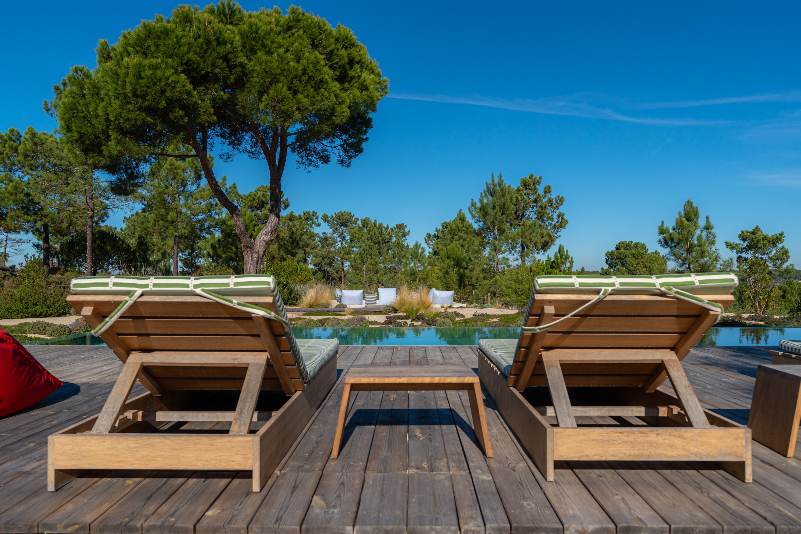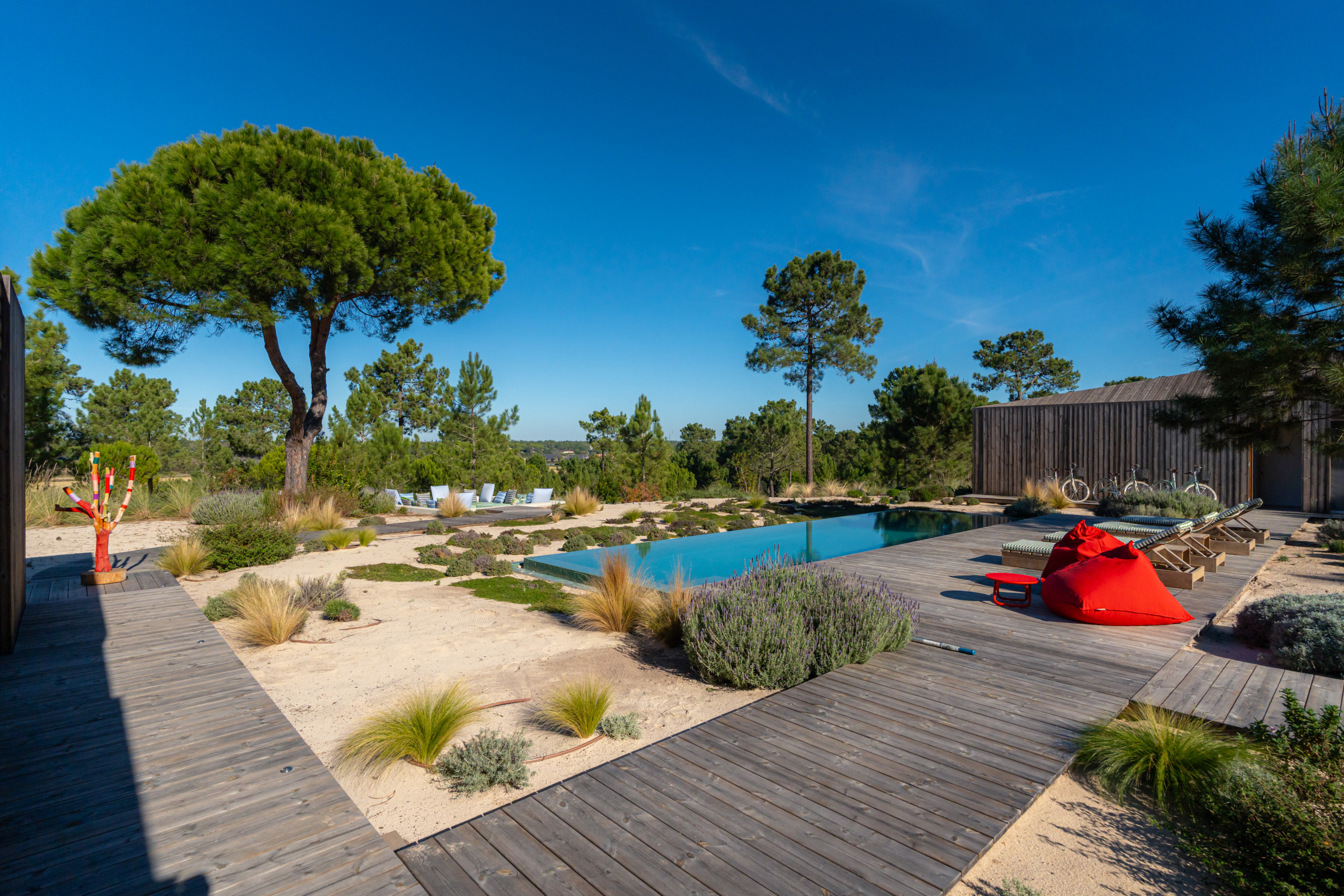 For wellness and relaxation, Villa Cypress also includes a fully equipped gym with sauna and an ice tub. Outdoors, the beautifully positioned pool area is surrounded by nature with great lounging spaces, making it an ideal choice for a relaxed family holiday in Comporta.