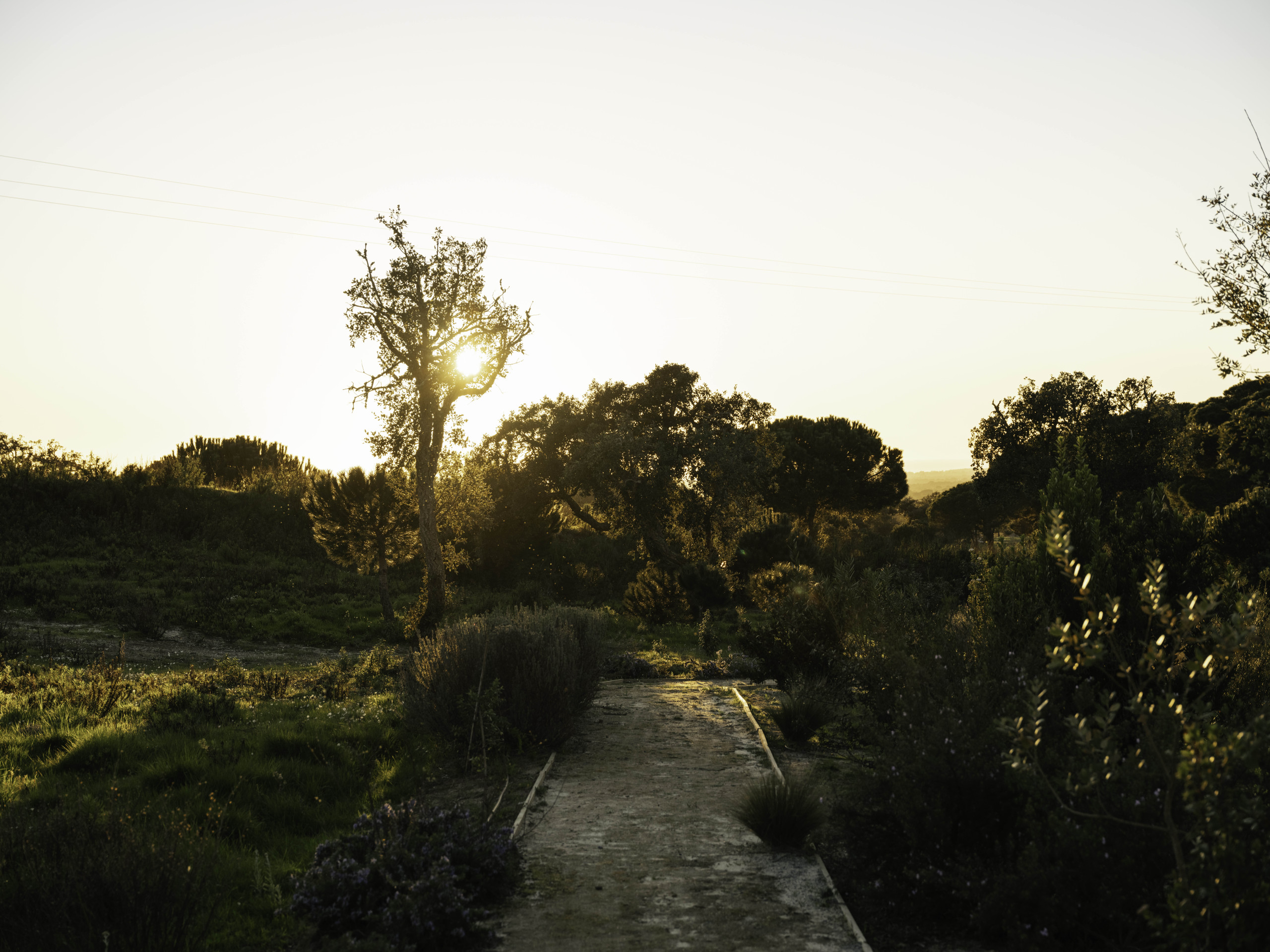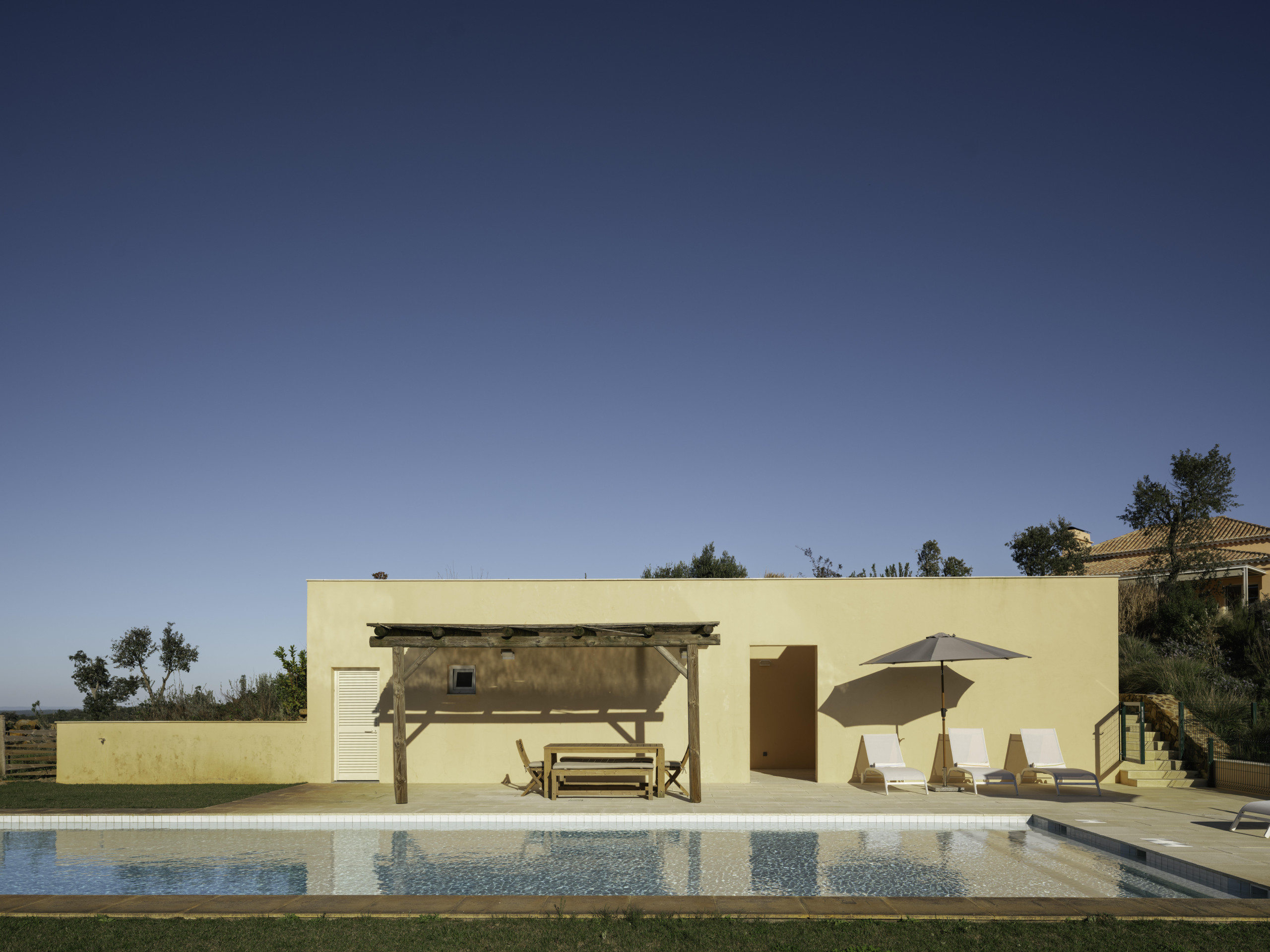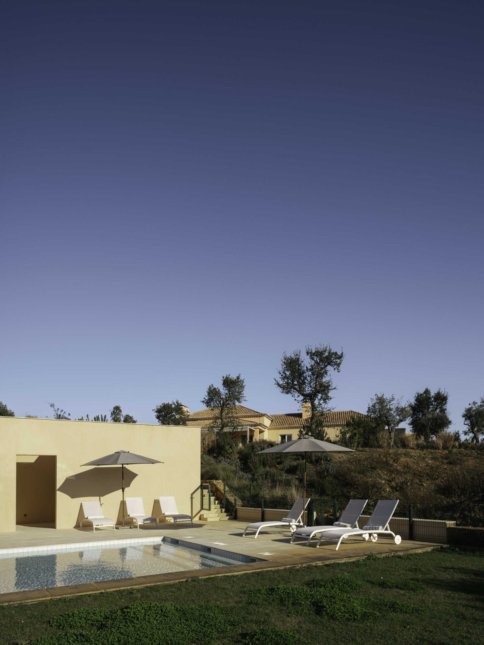 A short 100-meter stroll from the villa, a heated infinity pool awaits, surrounded by lush greenery with sweeping views of the hills, Melides Lagoon, and the Atlantic Ocean. Adjacent to the pool, a dedicated fitness and yoga deck provides the perfect space for wellness and relaxation.