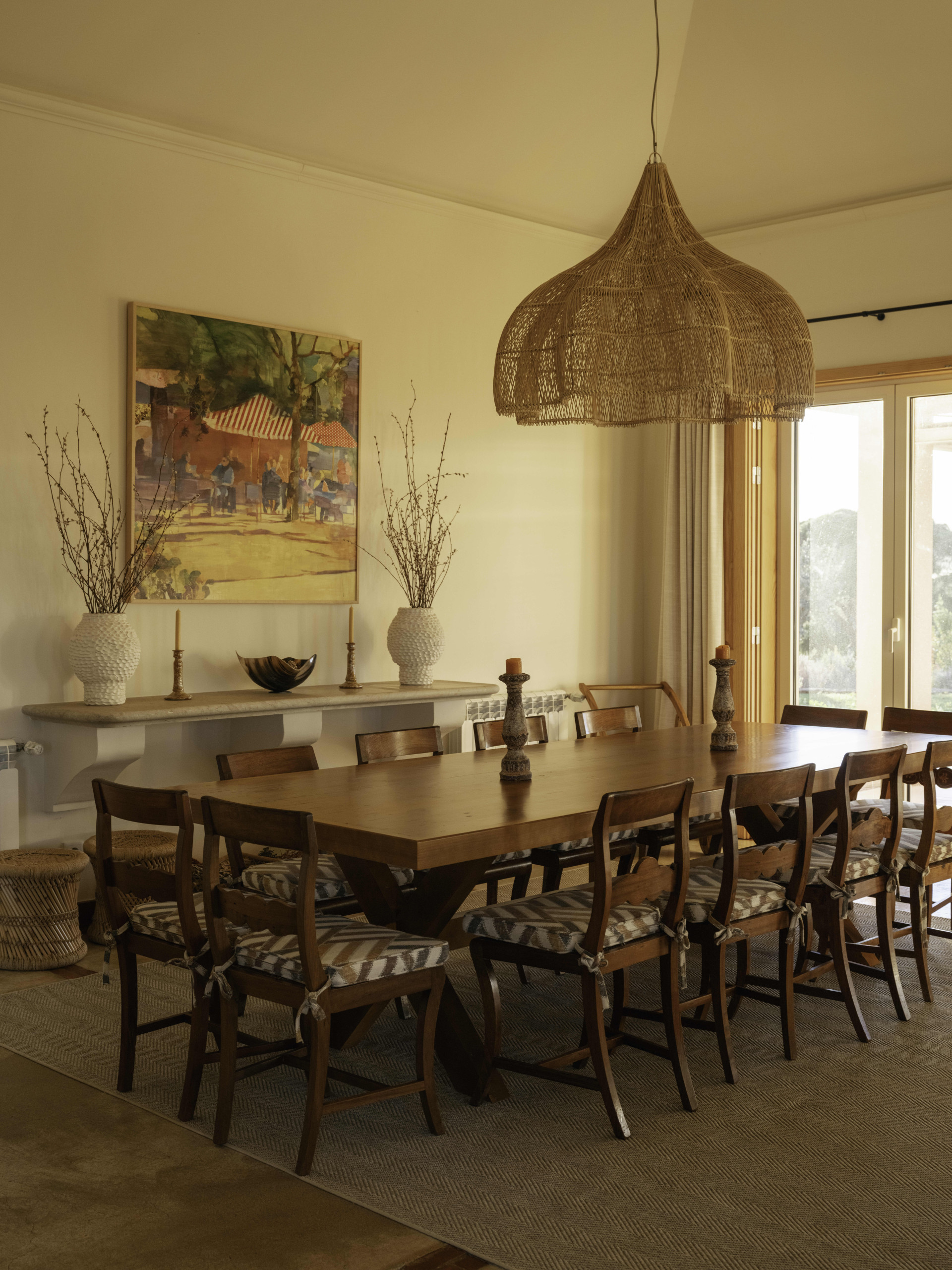 The house offers around 340 m² of living space and accommodates up to 13 guests. The interiors are warm and comfortable, with natural materials, soft tones and large windows that bring in plenty of light and open onto the surrounding terraces and garden. The main living room, with fireplace and generous seating, connects directly to the outdoor areas, while the dining room and fully equipped kitchen create an easy and relaxed space for gathering with family or friends.